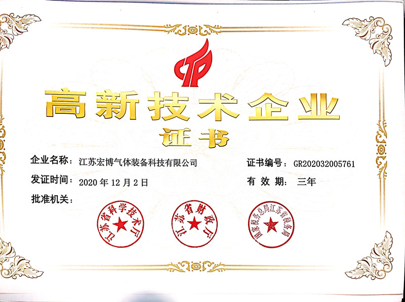 2020年,宏博企業(yè)江蘇宏博氣體裝備科技有限公司,生產(chǎn)基地-東臺(tái)宏博凈化科技有限公司同時(shí)獲評(píng)高新技術(shù)企業(yè),并于近日收到由江蘇省科學(xué)技術(shù)廳、江蘇省財(cái)政廳、國(guó)家稅務(wù)總局江蘇省稅務(wù)局聯(lián)合頒發(fā)的《高新技術(shù)企業(yè)證書(shū)》。