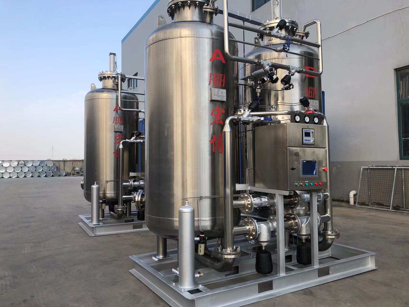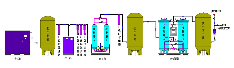 食品制氮機是以空氣為原料,以優(yōu)質(zhì)碳分子篩為吸附劑,運用變壓吸附原理(PSA),利用充滿微孔的分子篩,對空氣進行選擇性吸附,以達到氧氮分離的目的。分子篩在加壓時氧被優(yōu)先吸附,氮從非吸附相得到。這樣在氣相中可獲得氮的富集成分。因此利用碳分子篩對氧和氮在某一時間內(nèi)吸附量差別的這一特性,由自動控制軟件按特定時間程序進行加壓吸附,常壓解析的循環(huán)過程,完成氧氮分離,從而獲得高純度的成品氮氣。